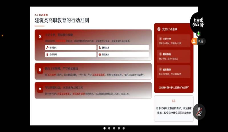学生党支部书记李超以“深学笃行重要讲话精神 以建工初心筑职教之基担重庆之责”进行微宣讲,他围绕深悟视察重庆讲话精神、践行教育重要论述、融合红岩精神底蕴、立足建工专业实际四大方面,阐释重庆“新时代西部大开发重要战略支点、内陆开放综合枢纽”的战略定位与建筑行业的新质生产力属性,明晰职业教育“职普融通、产教融合”的发展方向与培育大国工匠的核心目标,解读红岩精神与建筑职业精神的内在契合及红色基因传承路径,倡议全体党员精钻专业技能对接重庆城乡建设需求,发挥先锋作用带动优良学风。